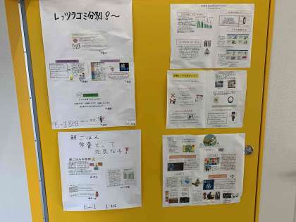 国語科の学習で学んだことを生かし、それぞれの班で決めたテーマについて調べ、発表ノートにまとめました。印刷したものをどんな順番で割り付けをすればよいか話し合いながら完成することができました。完成したポスターは、廊下に掲示しています。