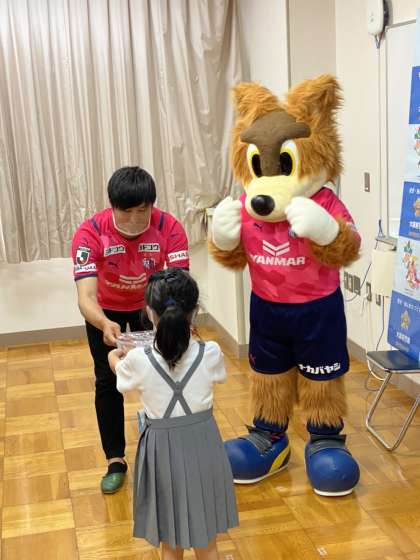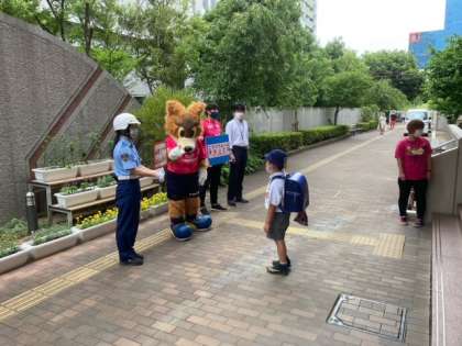 また、大阪府警とともに交通安全に取り組んでいるセレッソ大阪の方も来られ、ランドセルカバーの贈呈式や下校時の見守りをしてくださいました。マスコットのロビーくんの登場には大きな歓声があがっていましたよ。