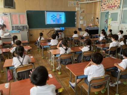 今日は警察の方に来て頂き、1年生の交通安全指導を行いました。クイズ形式で交通安全についてのお話をしてもらい、楽しんで学んでいる様子でした。