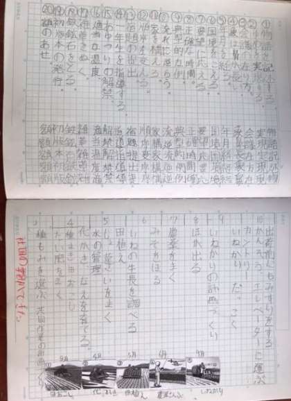 1枚目はノートを縦に使う工夫をしています。上半分を漢字の書き取り、下半分は社会科の復習と、使い分けています。資料もあって見やすいですね。