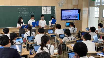 6年生は平和学習で大阪大空襲のことについて学習しています。これまで絵本や新聞から戦争について考えたり、空襲の被害にあった人の話をDVDで観たりしました。そこから感じたことをもとに、班で大阪大空襲について調べたことを発表ノートにまとめています。今日は来週の月曜日に3年生に発表する際のリハーサルを行いました。実際にリハーサルをやってみることで、画像や文字の見にくさや話すスピードが速いなどいろいろなことに気づくことができました。来週の発表うまくいくといいですね!