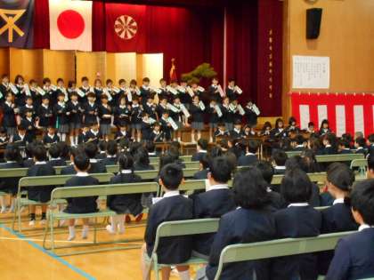 4月7日(火) 平成27年度の入学式を行いました。多くの来賓、保護者の方に見守られ61名の1年生を迎えました。1年生を歓迎するため、在校生を代表して6年児童があいさつをし、2年生児童が歓迎のことばや演技なども行いました。