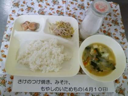 さけのつけ焼きは、こんがりと焼けて米飯とよく合っていました。みそ汁には、とうふやごぼう、えのきだけなどが入ってヘルシーでした。1年生は、「ごはんがもちもちでおいしいね。」「もやしははじめてだけど、全部食べられたよ。」とニコニコ顔でした。お箸の持ち方を習って、ほぼ全員が残さずきれいに食べることができていました。