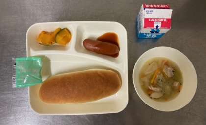【コッペパン、りんごジャム、フランクフルトのケチャップソース、スープ、焼きかぼちゃ、牛乳】