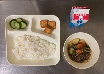 【ごはん、肉じゃが、あつあげのみそだれかけ、あっさりきゅうり、牛乳】