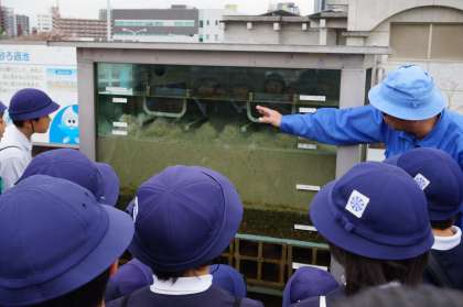 子どもたちは実際の施設を見学させていただき、その後、淀川の水がきれいになる仕組みについて模型と実験で説明していただきました。
