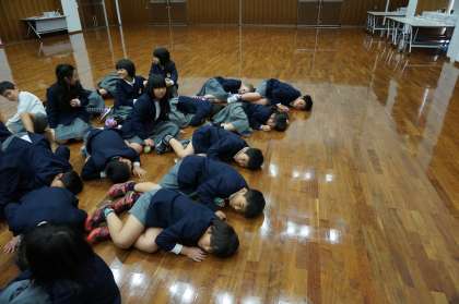 また、施設内の地下に貯水池が多くあることを教わり、床に耳を当てると水の音がしました。