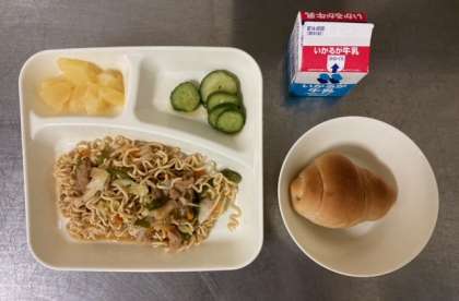 【黒糖パン1/2、やきそば、きゅうりのしょうがづけ、パインアップル(缶)、牛乳】