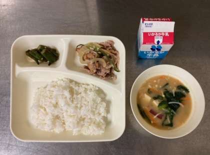 【ごはん、豚肉の甘辛焼き、みそ汁、オクラのおかかいため、牛乳】