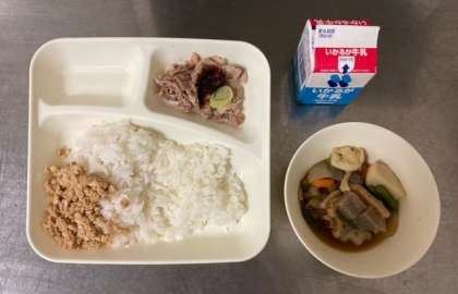 【ご飯、豚肉のねぎじょうゆ焼き、ふきよせ煮、ツナ大豆そぼろ、牛乳】