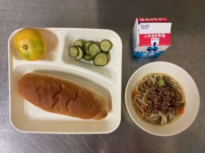 【黒糖パン、タンタンめん、きゅうりの甘酢づけ、みかん、牛乳】