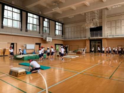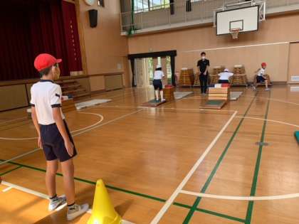 今日は、ゲストティーチャーの方が来て跳び箱の学習がありました。開脚とびと台上前転を学びました。それぞれ段階を踏んで、開脚とびや台上前転をしましたが、どの子どもたちも何度も何度もチャレンジをすると、最後の時間には多くの子どもたちがステップアップして、くるくると台上前転をすることができました。