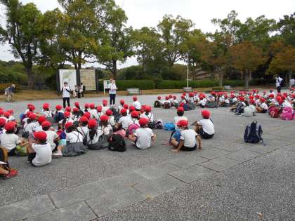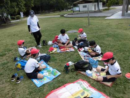 服部緑地公園では、オリエンテーリングを班ごとに行い、協力しながらゴールを目指してがんばりました。お弁当の後は、たのしみにしていた遊具で遊ぶこともできました。暑い中たくさん歩きましたが、電車の乗り方にも気を付け、とってもよくがんばりました。
