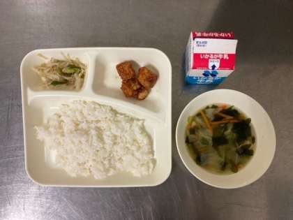 【ごはん、まぐろのオーロラ煮、すまし汁、もやしとピーマンのいためもの、牛乳】