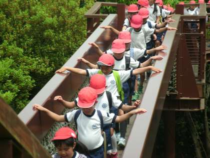 万博のシンボル”太陽の塔”を見たり、”ソラード”を通って自然を観察したりしました。近くで見た”太陽の塔”の大きさに驚き、塔にデザインされた3つの顔をまじまじと見ていました。ソラードの終点には、高台があり、そこから見える景色は最高でした。
