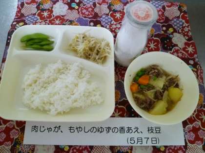 今日は肉じゃがでした。肉はいつも国産のものを使っています。じゃがいもとともに柔らかく煮え、米飯に合って食べやすかったです。1年生では「子どもの日にかしわもちやちまきを食べたよ。」、「しょうぶ湯に入ったよ。」などと話してくれました。連休疲れではしの進まない児童もいましたが、なんとか最後までがんばりました。