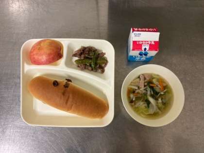 【レーズンパン、牛肉のオイスターソース焼き、中華スープ、りんご、牛乳】