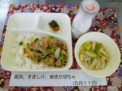 今日は豚丼でした。やわらかい国産肉がたっぷり入っていておいしかったです。すまし汁には、うすあげがたくさん入っていてヘルシーでした。