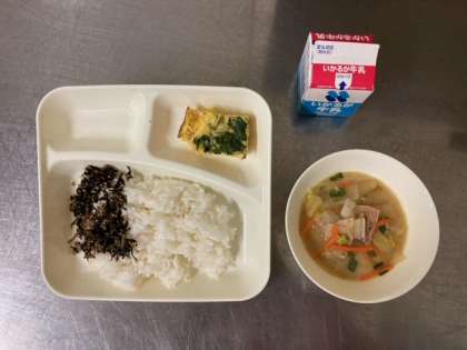 【ごはん、千草焼き、みそ汁、ごまひじき、牛乳】