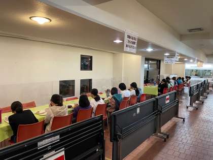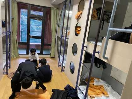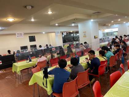 感染症対策で、グループごとに分かれての夕食の様子です。別のグループは入浴をしたり、部屋で着替えをしたりしています。