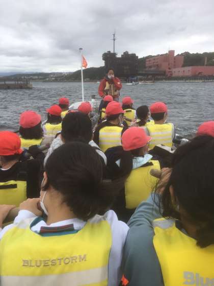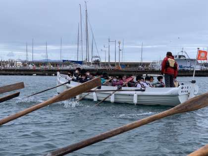2日目カッターボート、昨日に比べて風は強めですが、それ以上に子どもたちの漕ぎ方が上達しています!風に負けずに力強く漕ぎ進めることができています!!