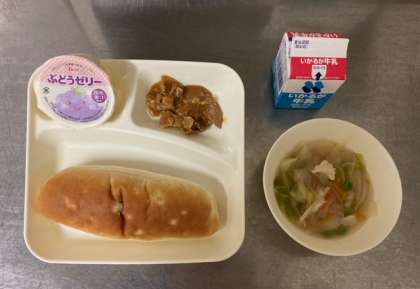 【おさつパン、豚肉のデミグラスソース、スープ、ぶどうゼリー、牛乳】