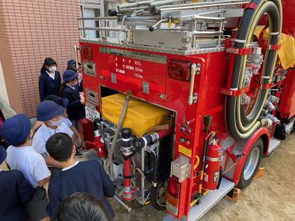 今日は消防署から出前授業に来ていただきました。LT車やポンプ車を目の前で見学させてもらい、はしごを高いところまで伸ばすところを見せていただいたときには「わあー!」と歓声がおこっていました。