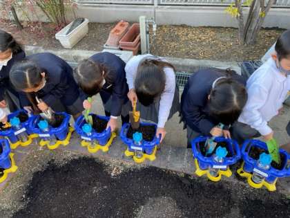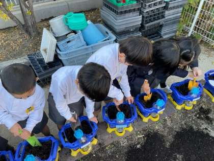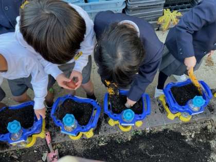 先日、チューリップの球根を植えました。あさがおの種と比べると大きな球根に、みんな驚いていました。観察をすると、「たまねぎの形みたい」「ここから、めが出るのかな」と様々な意見が出てきました。何色のチューリップが咲くのかな?大きく育つといいね。