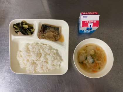 【ごはん、さばのみぞれがけ、すまし汁、こまつなの煮びたし、牛乳】