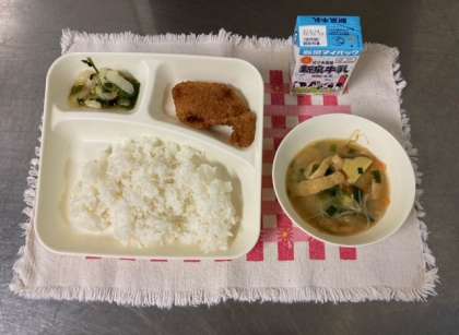 【ごはん、たらフライ、さつまいものみそ汁、きくなとはくさいのごまあえ、牛乳】