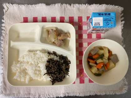 【ごはん、鶏肉のゆず塩焼き、含め煮、魚ひじきそぼろ、牛乳】