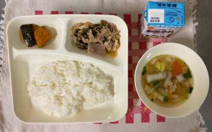 【豚肉と干しずいきのみそ煮、うすくず汁、焼きかぼちゃの甘みつがけ、牛乳】