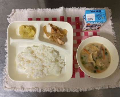 【ご飯、鶏肉の甘辛焼き、かす汁、くりきんとん、牛乳】