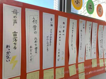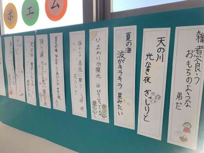 国語科の「心が動いたことを十七音で表そう」の単元では、学習したことをもとに、俳句をつくりました。オノマトペや比喩表現などを意識し、工夫してつくることができました。今日はつくった俳句の交流をし、友達の俳句のよさを感じることができました。