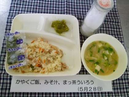 茶摘みのシーズンに合わせて、まっ茶ういろうが出ました。上新粉、砂糖、まっ茶、水を合わせて給食室の焼き物機で蒸しあげた手作りの和風デザートです。日本の緑茶は、同じ茶の木から作る紅茶などにはほとんど含まれていないカテキンやビタミンCを多く含み、和食ブームに伴って世界中から注目されています。まっ茶ういろうは子どもたちに大好評でした。
