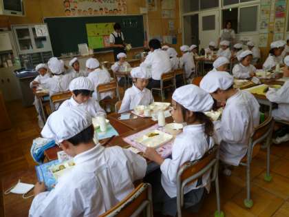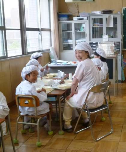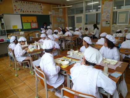 2年生と4年生がクラスの半分ずつ入れ替わって、交流給食をしました。違う学年の人や、校長先生、給食調理員さんなど担任外の先生方と一緒に楽しく食べました。