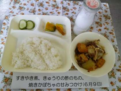 すき焼き煮とご飯がよく合って肉(国産)もたくさん入っていておいしかったです。かぼちゃ、きゅうりの小さなおかずは色よく仕上がり、食欲をそそりました。