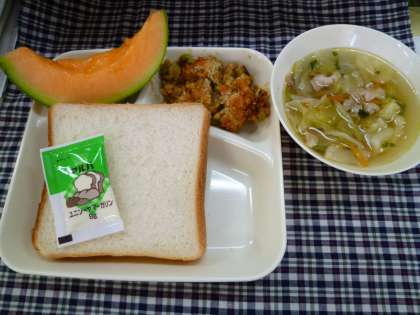 カレードリアは、こんがりと焼けて中はとろりとしておいしかったです。野菜たっぷりのスープと、豪華なクインシーメロンがつきました。