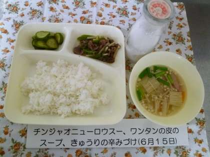 チンジャオニューロウスーは、ピーマンがしっかりと入っていましたが、肉のうま味でみんな残さずに食べていました。スープには、えのきたけがたっぷり入ってヘルシーでした。
