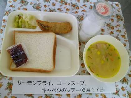 サーモンフライは、カラッと揚がり、サクサクしておいしかったです。コーンスープも子どもたちに人気のメニューで、今日はパンも牛乳も全く残りませんでした。たくさん食べて、すくすく成長してほしいです。