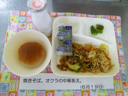 小さな黒糖ロールは、ふわふわしておいしかったです。子どもたちに大人気の焼きそばは、豚肉やいかと野菜がたっぷり入っていました。きざみのりをかけていただきました。旬のオクラは色よく仕上がっていました。