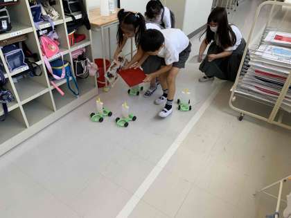 3年生は理科の学習で、風とゴムの力のはたらきについて学習しています。今日は実験キットを組み立てて、送風機を使って風の強さでものを動かす働きは、どのように変わるのかを実験しました。風の力が強いときと弱いときのちがいに気づくことができました。