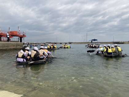 カッターとは違い、膝までは確実に水に浸かります!思うように進まないいかだを操作しながら、ボール拾いや水かけなどを楽しみました!