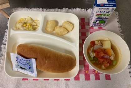 【コッペパン、ブルーベリージャム、いかてんぷら、フレッシュトマトのスープ煮、サワーソテー、牛乳】