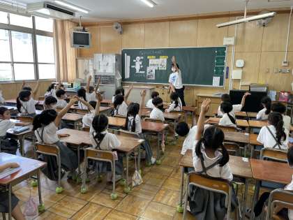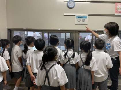 3日間に分けて、給食室の見学と栄養指導が行われました。はじめて見る給食室の大きなお鍋や調理器具に驚いていた子どもたちでした。その後、教室では栄養士の先生に給食調理員さんや調理器具などについて詳しく学びました。