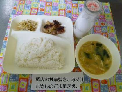 豚肉の甘辛焼きは、しっかりとした味が米飯によく合い、かぼちゃ入りのみそ汁ともやしのごま酢あえはヘルシーで良かったです。