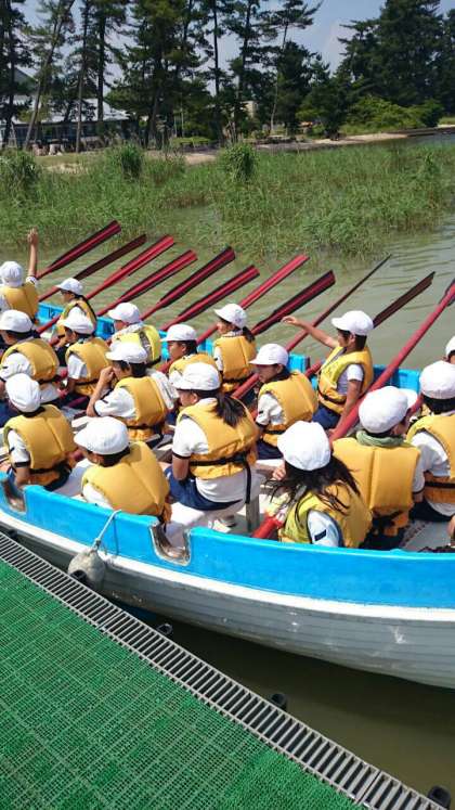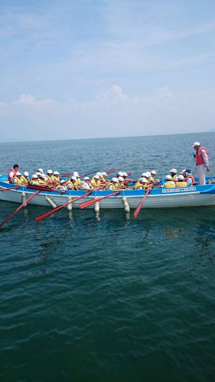 琵琶湖でカッター訓練をしているところです。2人で1本のオールをかけ声に合わせて漕ぎ、みんなの力でボートを進めます。チームワークが大切な活動です。