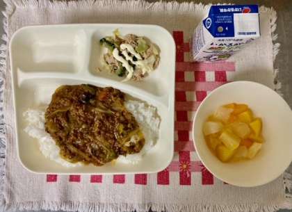 【夏野菜のキーマカレーライス、ゴーヤとツナのマヨネーズ風味、ミックスフルーツ(缶)】