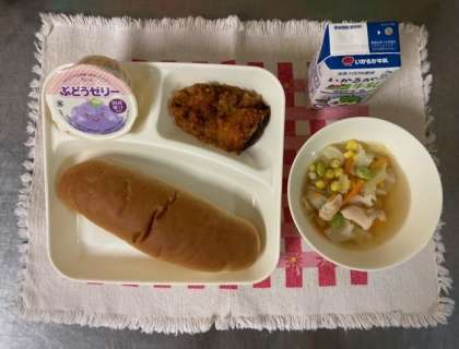 【黒糖パン、かぼちゃのミートグラタン、スープ、ぶどうゼリー、牛乳】