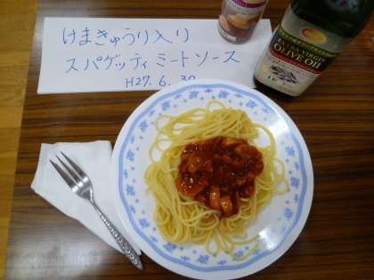 栽培委員会と給食委員会の児童は、毛馬きゅうり入りスパゲッティミートソースを家庭科室でいただきました。